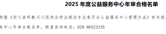 四川省科教兴川促进会学业规划专业委员会2025年度公益服务中心年审合格名单四川省科教兴川促进会学业规划专业委员会2025年度公益服务中心年审合格名单