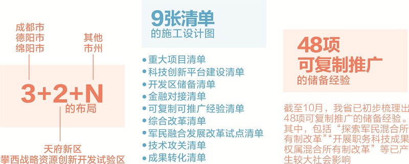 事实证明了这一点。今年,成都加快构建“三个十条”组成的全面创新改革试验政策保障体系,建立全面创新改革试验监测体系;德阳制定激发三类创新主体活力的政策35类155条,制定破解制约创新突出问题的创新政策39类173条;绵阳率先启动军民融合企业认定试点工作,目前已有460多家“军转民”“民参军”企业;天府新区明确1个目标、7大任务、37条改革举措的全创工作体系;攀西战略资源创新开发试验区提出以科学开发利用资源为核心的要求;各市州积极对接成德绵先行先试的经验和做法,寻求在当地推广和复制,结合自身特点,选择合适领域先行先试……从成都平原到攀西河谷,从秦巴山脉到川西高原,四川大地,已全方位参与到全面创新改革的试验中。