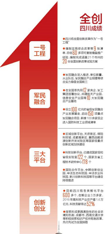 新变化源自新机遇。2015年8月,四川等8个区域被确定为国家系统推进全面创新改革试验区。全面创新改革试验,是改革开放近40年来中央交给四川最重要的改革任务,作为引领发展的“一号工程”,一年多来,四川已在军民融合、科技成果转化、人才培养、金融服务等多个领域大胆创新,亮点频现。