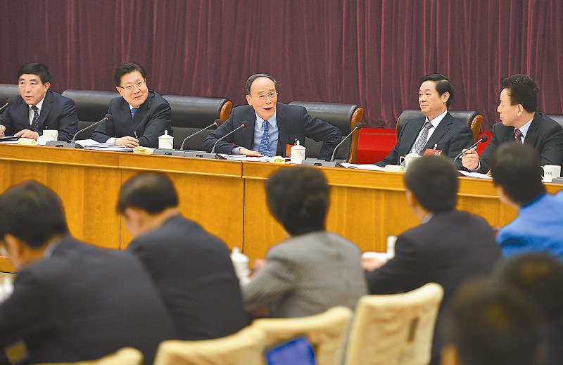 迎着掌声步入会场,王岐山来到代表中间,与大家一一握手、亲切交谈。审议中,代表们踊跃发言。在听取代表们发言后,王岐山指出,打铁还需自身硬。纪委对自身的监督必须更加严格,执行纪律必须更加刚性。中央纪委加强审查办案全过程管理,开展清退会员卡活动,对纪检监察干部违反八项规定精神案件一律点名道姓公开曝光,接受群众监督和媒体监督。信任不能代替监督。中央纪委决定成立纪检监察干部监督室,加强对纪检监察干部的执纪监督,用铁的纪律打造过硬队伍。